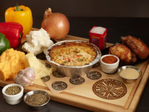 Brit Boy Birria Pasty and Lifestyle BackgroundSpicy Sausage Roll by Brit Boy Street Food cut in half and staged with ingredients